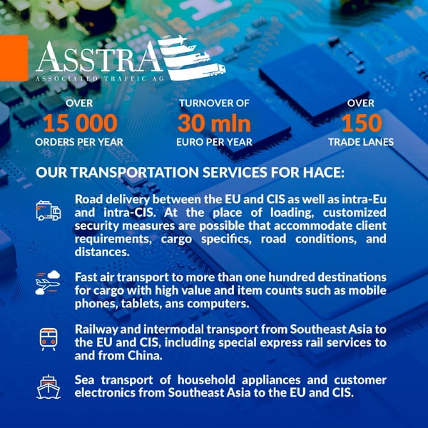AsstrA - сучасний і надійний постачальник логістичних послуг для виробників побутової техніки , електроніки, HiTech обладнання та телекомунікаційної продукції. Компанія надає логістичні послуги для оптових складів і роздрібних продавців. Завдяки накопиченому досвіду і налагодженому процесу роботи в 2012 році в компанії було створено спеціалізований підрозділ AsstrA HiTech Logistics, співробітники якого пропонують ефективні логістичні рішення саме для підприємств-виробників побутової техніки і електроніки. Досвід, висока якість послуг і максимальні стандарти безпеки перевезень підтверджені численними рекомендаціями Клієнтів.