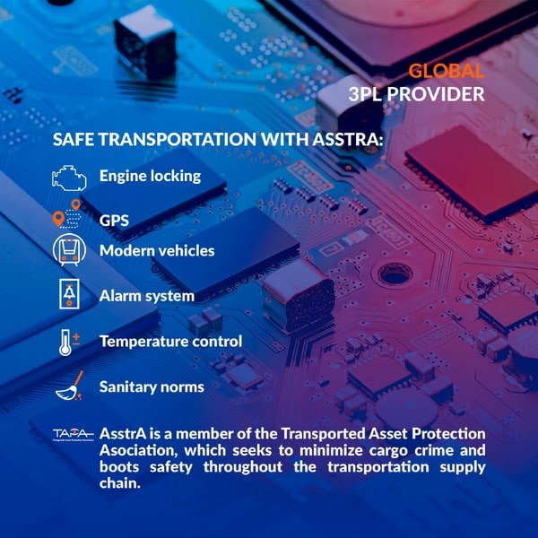 Під час транспортування побутової техніки та електроніки зупинка і стоянка заборонена тільки на безпечних і схвалених парковках і стоянках. Водії проходять обов'язкове навчання міжнародних перевезень дорогих товарів. Для постійного контролю над процесом перевезення забезпечена можливість цілодобового відстеження руху транспорту. Високу якість наших послуг підтверджують також відповідні сертифікати якості та членство AsstrA в TAPA (Transported Asset Protection Association).