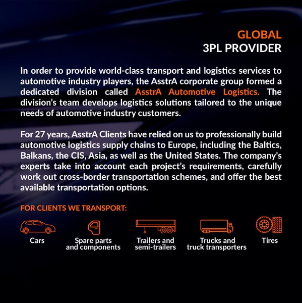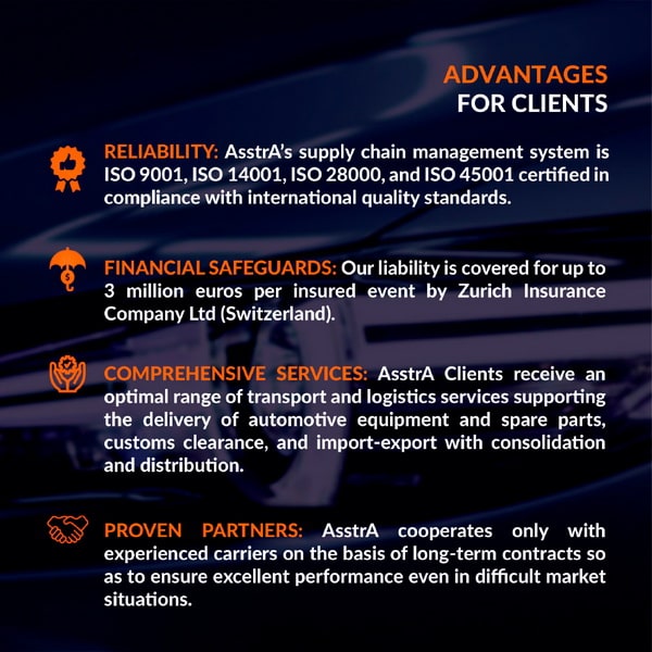 AsstrA ефективно співпрацює з підприємствами автомобільної промисловості. Для якісного обслуговування Клієнтів ми створили підрозділи, в яких профільні фахівці розробляють індивідуальні рішення, для максимального задоволення потреб Клієнта. Завдяки організації якісної та своєчасної логістики компанія отримує позитивні відгуки та рекомендації від автоконцернів по всьому світу. Клієнтський портфель AsstrA з автомобільної промисловості та суміжних з нею галузей збільшується з року в рік. Транспортування здійснюється автомобільним, залізничним, авіа та морським транспортом, контейнерами або з використанням комбінованих схем доставки через основні порти з повним контролем митного очищення та перевалки.