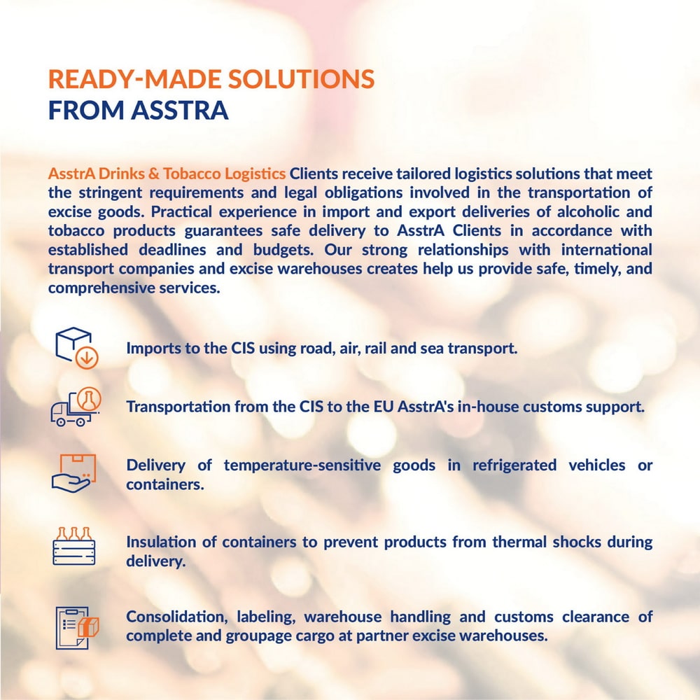 AsstrA – надійний логістичний Партнер для компаній, які займаються виробництвом, імпортом та продажем алкогольної продукції. Для забезпечення високої якості послуг і задоволення індивідуальних потреб Клієнтів AsstrA ми створили відділ AsstrA Drinks & Tobacco Logistics, основною спеціалізацією якого є імпорт і експорт вина, вермуту і міцних спиртних напоїв.