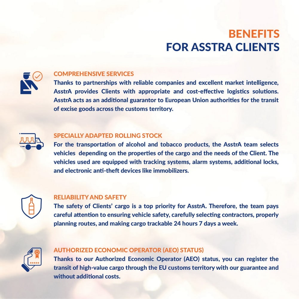 AsstrA є ліцензованим митним перевізником, що дозволяє доставляти алкоголь під гарантію митного перевізника без оформлення одержувачем вантажу гарантійного сертифікату.