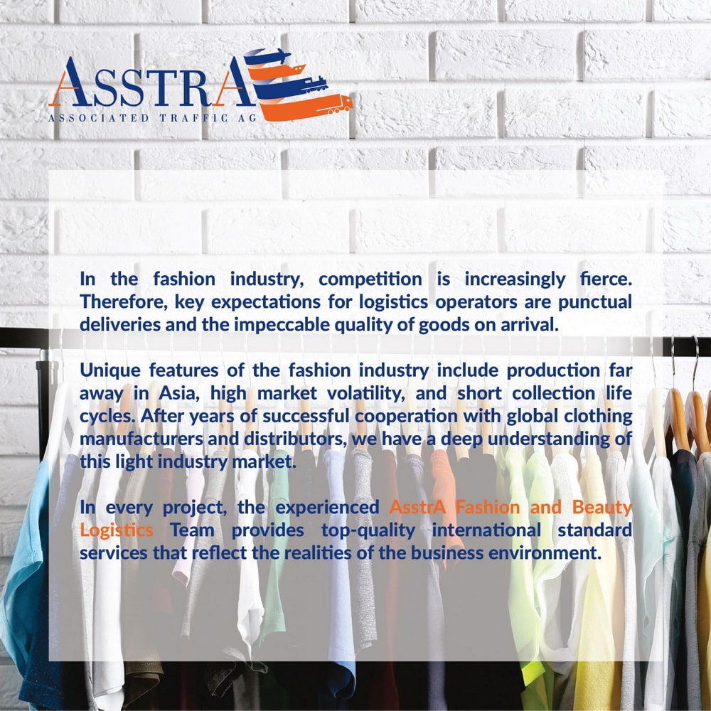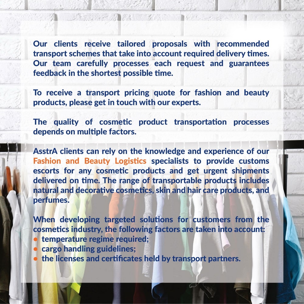 Група компаній AsstrA надає комплекс транспортно-логістичних послуг з організації та здійснення міжнародних перевезень косметичної та парфумерної продукції в Україну та інші країни, включаючи засоби по догляду за волоссям і тілом, а також декоративну косметику. Вітчизняний ринок косметики та парфумерії відновився після кризи і показує позитивну динаміку з 2015 року. За прогнозами аналітиків, найближчим часом очікується підвищення середньорічних темпів зростання продажів у даному сегменті. Оскільки ринок косметичної та парфумерної продукції в значній мірі формується за рахунок імпорту іноземної продукції, для його успішної роботи потрібна грамотна логістична система, яка може забезпечити великі обсяги поставок.