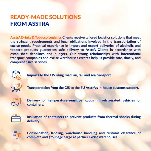 Багаторічний досвід, індивідуальний підхід до кожного Клієнта та професіоналізм співробітників AsstrA дозволяють гарантувати оперативну доставку тютюну і тютюнових виробів з урахуванням всіх законодавчих норм і правил.