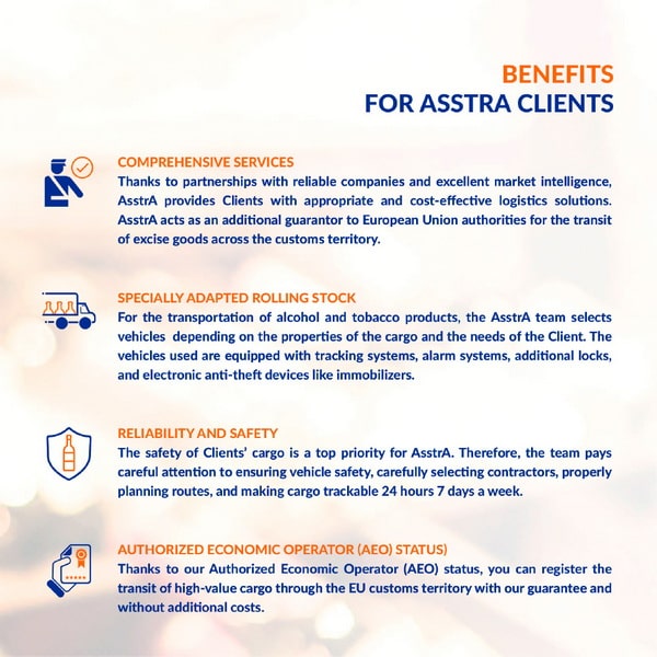 AsstrA має статус ліцензованого митного перевізника, що дає можливість здійснювати перевезення тютюну та тютюнової продукції без митного супроводу та сплати митних платежів що значно скорочує транспортні витрати.