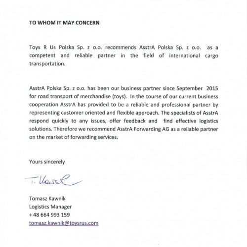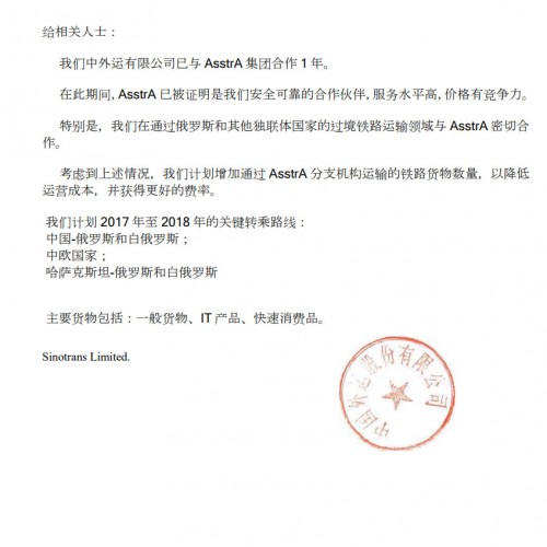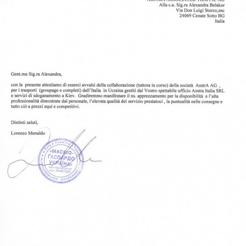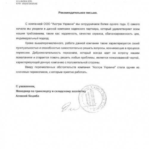 AsstrA пропонує своїм Клієнтам перевезення всіма видами транспорту з розробкою оптимального маршруту і вартості виходячи з індивідуальних потреб і вимог Клієнта. Досвідчені спеціалісти AsstrA організують перевезення різних категорій вантажів, включаючи швидкопсувні та небезпечні, в будь-яку точку світу в оптимальні терміни. Висока якість послуг підтверджують численні позитивні відгуки та подяки від постійних Клієнтів AsstrA з різних регіонів і галузей промисловості.